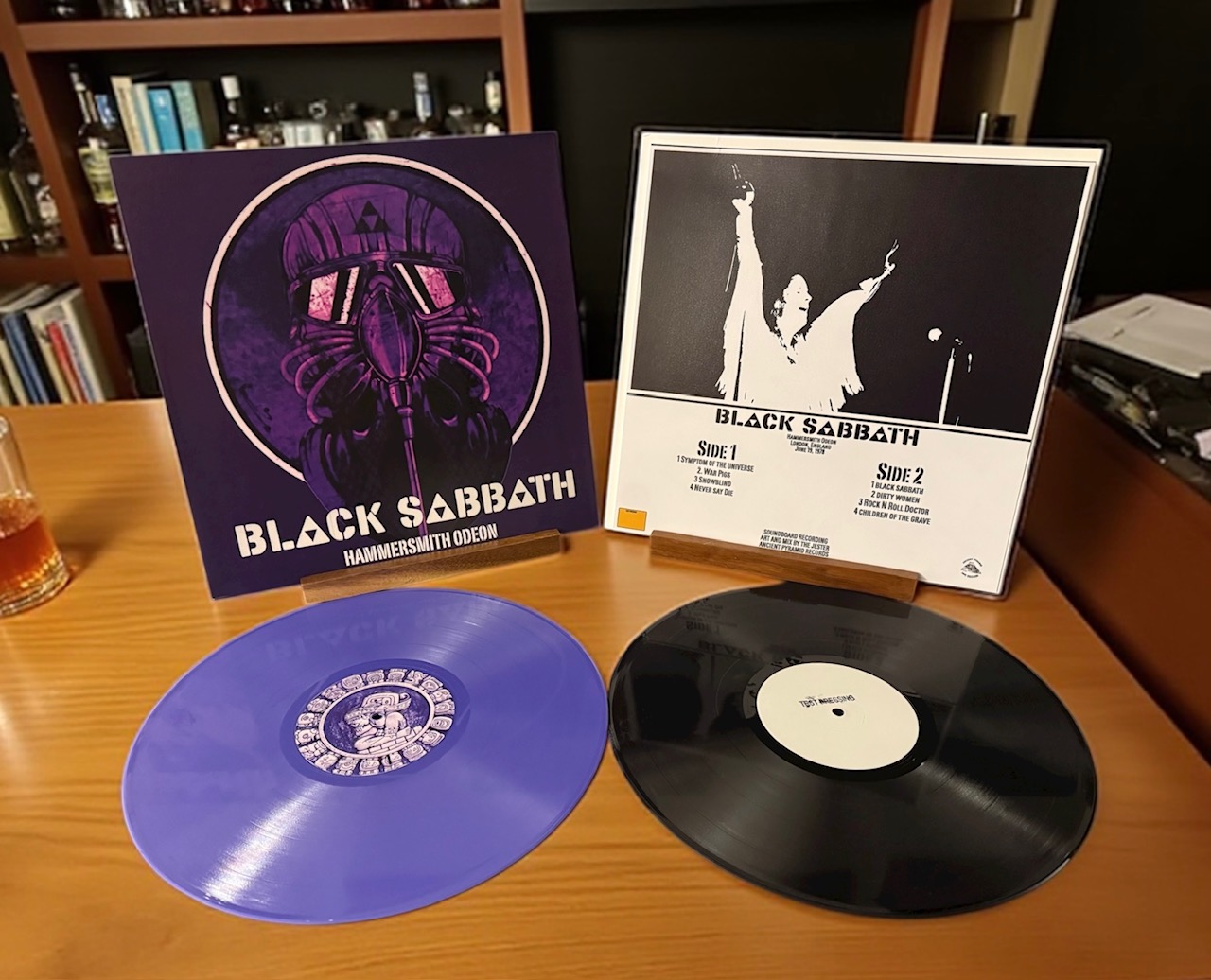 Hammersmith Odeon comes in several different colors, and there are also test pressings available. The standard colored editions come numbered out of 500 copies and have the number on the back of the jacket. The test pressings are old school bootleg style and come in a white sleeve with stickers and inserts. Just like their Ozzy release, the inserts are printed on photo paper which is super high quality. I’ve always loved the fighter pilot guys from Never Say Die!, so I think the standard jacket looks great. The test pressing is probably my favorite visually, just because I love the old style and the picture of Ozzy looks great in black and white. I was lucky enough to get a black test pressing that’s numbered out of 10 copies, and a standard purple version which has a bit of marbling to it.