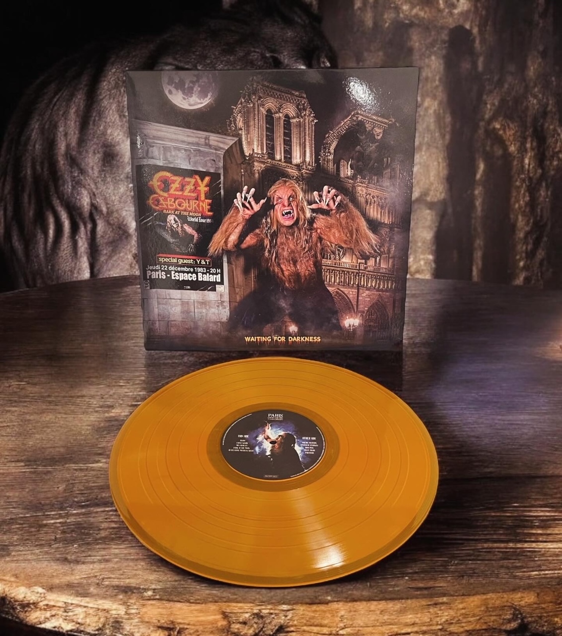 Waiting For Darkness is available on several different colors of wax, and in two different versions. Personally, I picked up the orange and purple splatter pressings. When I originally ordered my copies, I had no idea they would be different… I was just trying to grab my favorite colors. As it turns out, the solid colors (orange, yellow and blue) all come in a regular jacket with one version of the artwork, while the splatter colors (purple/white and blue/yellow) come in a gatefold jacket with a second version of the artwork. Even the photos on the backs are different, but both use the same formatting. Both editions come with a postcard, and both of mine were the same, featuring black and white photos of Ozzy getting in full werewolf regalia. I have seen some other people post photos where it appears they got a postcard with a different image, however.